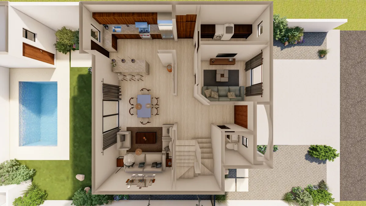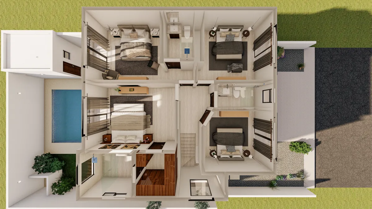 Opcionales: pérgola, pasto sintético, minisplits o alberca
